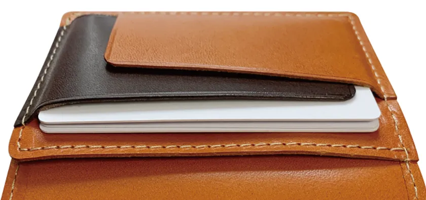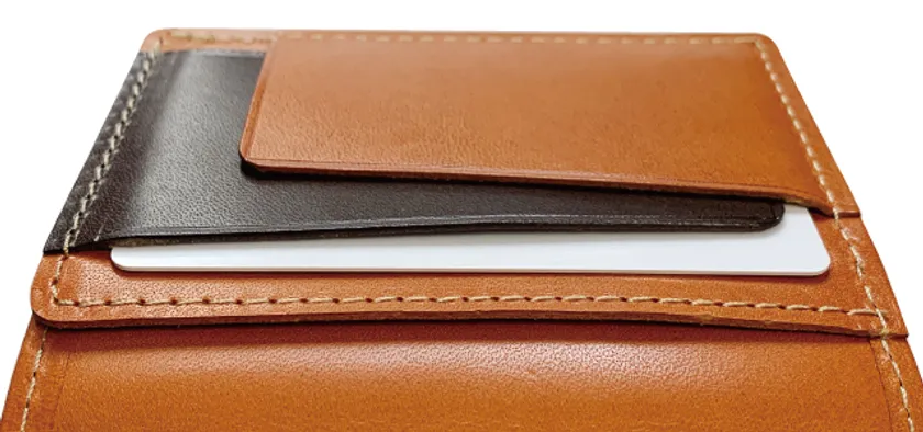 収納する枚数によってカードをホールドするフラップが可動し、常にフィットしてカードをホールド。