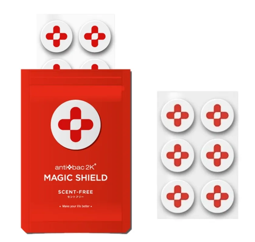マジックボール専用ソリューションはNPO法人バイオメディカルサイエンス研究会の稼働試験により抗ウィルス除去データを持ち、その専用ソリューションの技術をマジックシールドにも搭載しています。マスクの内側に貼ることで、長時間マスクを着用することで生じる息苦しさやニオイなどの不快感を軽減し、コロナ禍の快適なマスクライフを実現します。マジックボールのカプセル化技術はインフルエンザ、MERS、SARSをはじめコロナウイルスといったエンベロープウイルスを包み込むという除菌消臭メカニズムでマジックシールドにも空気洗浄・除菌消臭といった研究を長年行っているアンティバック2K独自の技術が活かされています。このコロナ禍でマスクの着用がニューノーマルとなり、長時間マスクをすることが避けられない職種の方などに科学的技術によって裏打ちされた清潔で安全、快適な環境をお届けします。マジックシールドはマスクの内側に装着するだけという手軽さで除菌・消臭が期待される今までにない商品です。
