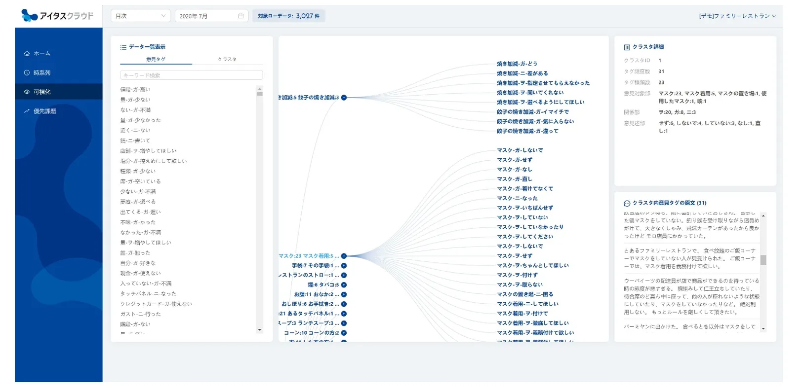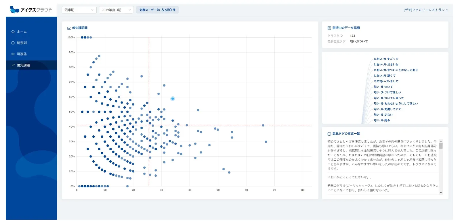 「アイタスクラウド」は最先端の自然言語処理技術を用いた文章解析AI「アイタス」をエンジンとするデータ解析ダッシュボードであり、VOCを可視化するだけでなく、独自のフレームワークにより優先課題を明らかにすることで課題解決のヒントを見つけ、打ち手に繋げることができる業務支援ツールです。