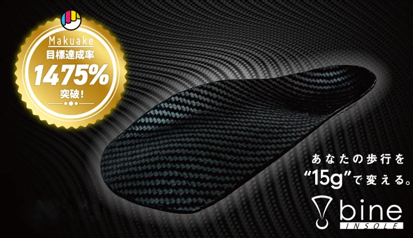 ◇Makuakeプロジェクト公開後わずか3時間で目標達成! 達成率1,475%超、1,645名が支援◇ たった15gで劇的に歩行パフォーマンスを向上させる インソール「bine(バイン)」