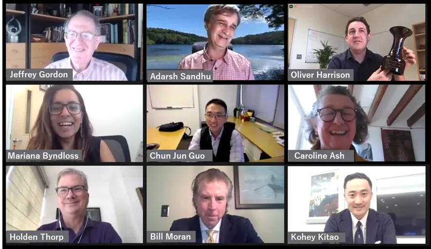 第1回目はScience誌の編集者を含む審査委員会が慎重に検討した結果、Benaroya Research InstituteのOliver Harrison博士がグランプリに選ばれました。Harrison博士はヒトなどに共生する微生物と免疫システムとの相互作用について研究を進めており、その研究成果はアトピー性皮膚炎、乾癬[*3] 、炎症性腸疾患などの治療法の開発に繋がると期待されています。受賞者には賞金25,000ドルを授与され、またScience本誌に小論が掲載されました( https://science.sciencemag.org/content/369/6500/152 )。授賞式は当社 代表取締役CEOの北尾 浩平、Scienceの出版者のBill Moran氏、編集長のHolden Thorp氏、またMicrobiome研究の第一人者であるJeffrey Gordon博士が参加され、受賞者にお祝いの言葉を贈られました。