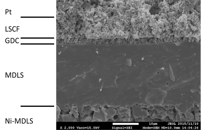 本研究においては、マグネシウムをドープしたLa9.8(Si5.7Mg0.3)O26.4(MDLS)を主な固体電解質として用い、組成の異なったランタンシリケート系物質であるLa2SiO5を組み合わせることにより、さらなるイオン伝導度の向上と固体電解質膜の緻密化を達成することができました。またGd(ガドリニウム)をドープした二酸化セリウム(Ce0.9Gd0.1)O1.95(GDC)を中間層として用いることにより、熱処理時の固体電解質とカソードの反応を抑制し、電池抵抗の上昇を抑えることに成功しました。カソードとしては(La,Sr)(Co,Fe)O3を用いて、スピンコート法やスクリーン印刷法などの簡便で安価になりえる印刷手法を用いることにより、アパタイト型ランタンシリケート系固体電解質を用いたSOFCを作製しました。今後はランタンシリケート系の固体電解質層のイオン伝導度がさらに向上するように、イオン伝導経路を最適な方向にそろえるなどの工夫などを検討し、さらなるイオン伝導性の向上、及びそれを応用したSOFCを開発することを目指します。