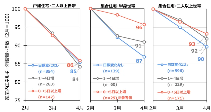 ●集合住宅に住む2人以上世帯では、単身世帯と比べると在宅勤務日数の変化による影響は小さい。戸建住宅に住む世帯の場合は、在宅勤務日数の変化による影響は確認できなかった。(図 1左および右)