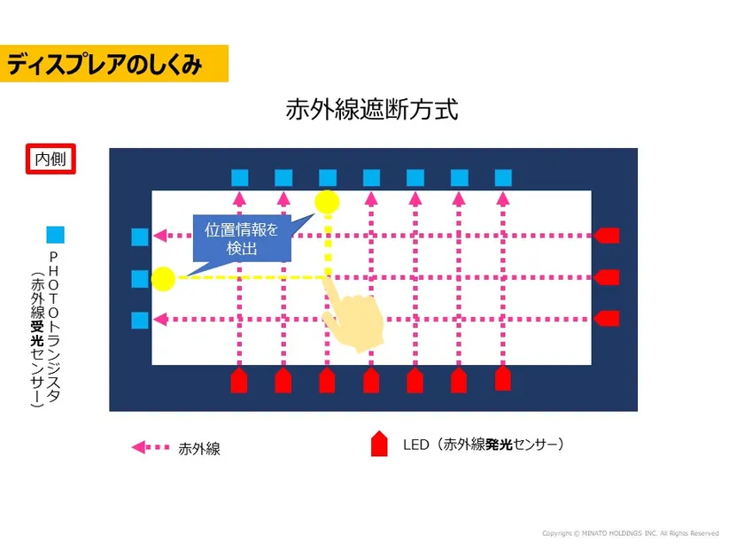 ・<赤外線遮断方式>というタッチパネルの原理を応用した「非接触赤外線センサー」であり、枠にはLED等が実装された基板が内蔵されています。このLEDから赤外線を放出することで位置情報を検出、画面に直接触れることなく、端末を操作することができます。
