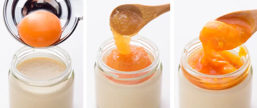 ~生卵の黄身をあとのせ、プリン生地と混ぜて食べる新食感スイーツ~