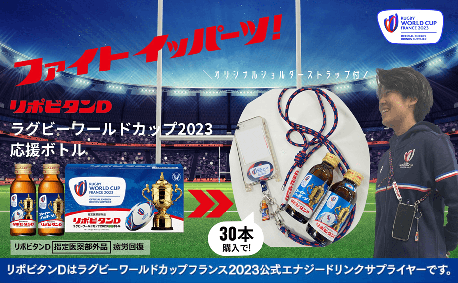 大正製薬が通販サイトで数量限定発売している「リポビタンD ラグビーワールドカップ2023応援ボトル」を30本セット購入された方の特典として、「オリジナルスマートフォンショルダーストラップセット(フォンタグ・リポビタンD ラグビーワールドカップ2023ボトル型チャーム)」がゲット出来ます。