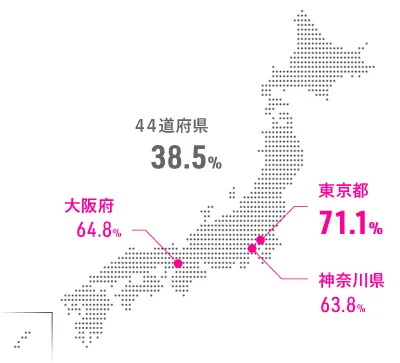 一方、その他の44道府県では38.5%に留まりました。最も経験者の割合が高い東京とは、32.6ポイントの差となっています。