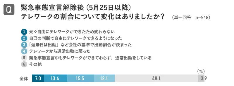 自己の判断で自由にテレワークできるようになった人は、6割以上がポジティブな一方、宣言解除後に出社割合や通常出勤を命じられた人の3割はネガティブ。
