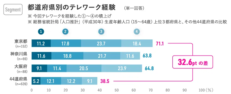 東京は7割以上がテレワークを経験、44道府県と32.6pt差。