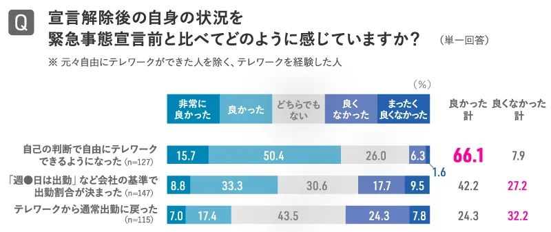 緊急事態宣言を機に「自己の判断で自由にテレワークできるようになった」人は、66.1%が「非常に良かった」「良かった」と回答。一方で、「会社の基準で出勤割合が決まった」、「通常出勤に戻った」人は、30%近くが「良くなかった」「まったく良くなかった」と回答しました。