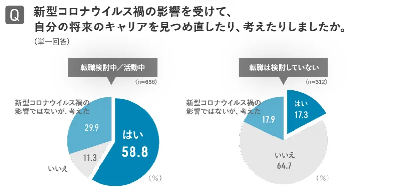 調査時点で「転職検討中/活動中」の人のうち、新型コロナウイルス禍の影響で自身の将来のキャリアについて見つめ直したと回答したのは58.8%、「転職は検討していない」人では17.3%。両者には41.5ポイントの差がありました。