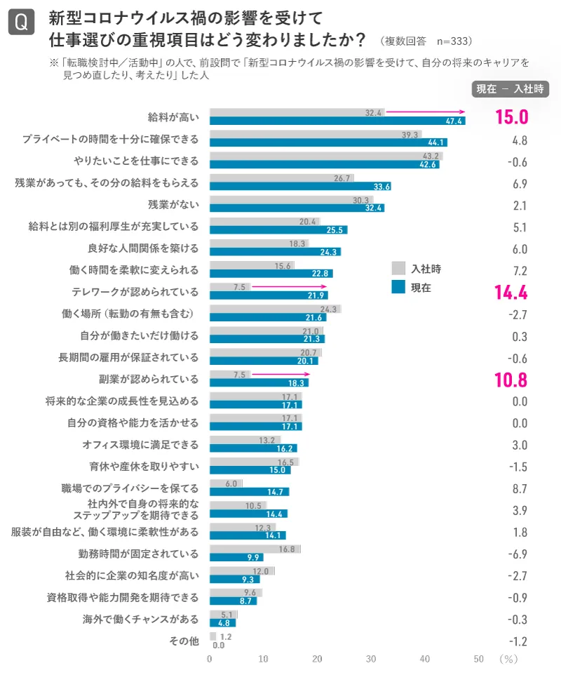また、調査時点で「転職検討中/活動中」の人のうち、新型コロナウイルス禍の影響で自身の将来のキャリアについて見つめ直した人の、仕事選びで重視する項目の変化が大きい上位3位は、「給料が高い(+15.0pt)」、「テレワークが認められている(+14.4pt)」、「副業が認められている(+10.8pt)」でした。