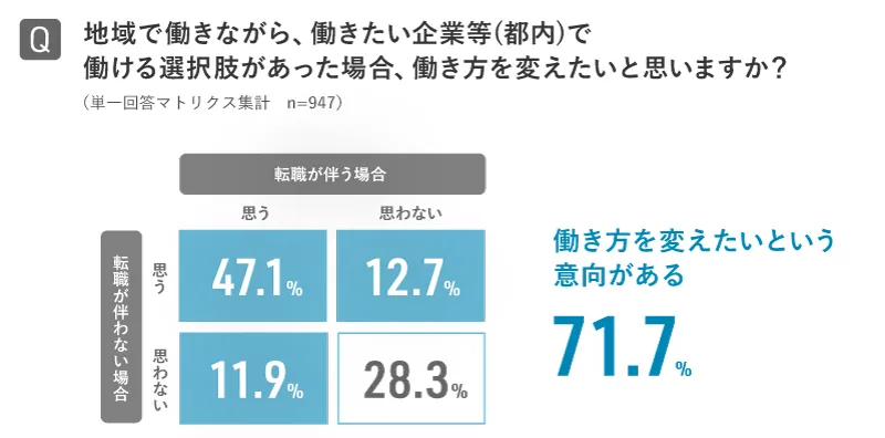 地域で働きながら、働きたい企業等(都内)で働ける選択肢があった場合、働き方を変えたいという意向がある人は71.7%にのぼりました。「転職が伴う場合」でも59.0%が働き方を変えたいと回答しています。さらに、47.1%が「転職が伴う場合」のみにおいて、働き方を変えたいという意向があるという結果になりました。