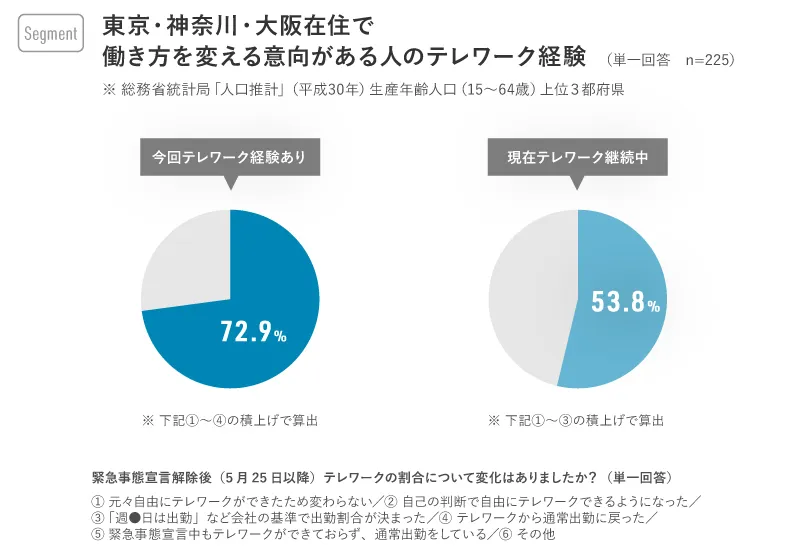 意向がある人のうち、生産年齢人口が上位3位の東京・神奈川・大阪の3都府県在住者を見てみると、今回の緊急事態宣言下でテレワークを経験したのは72.9%、調査時点でテレワーク継続中の人は53.8%。でした。