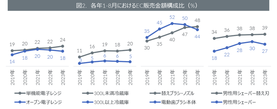 2023年は全般的にEC市場の拡大に一服感がみられているものの、一部の製品においてはEC比率が拡大しているものもあった。コロナ禍で拡大したEC市場が今後どのような変化を見せていくのか、引き続き注目が集まる。