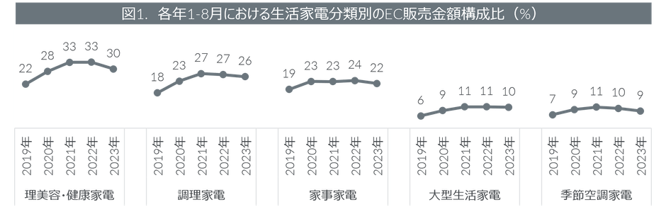 ・2023年18月におけるEC販売金額構成比は、5つの生活家電分類*2で前年同期から13%ポイント縮小