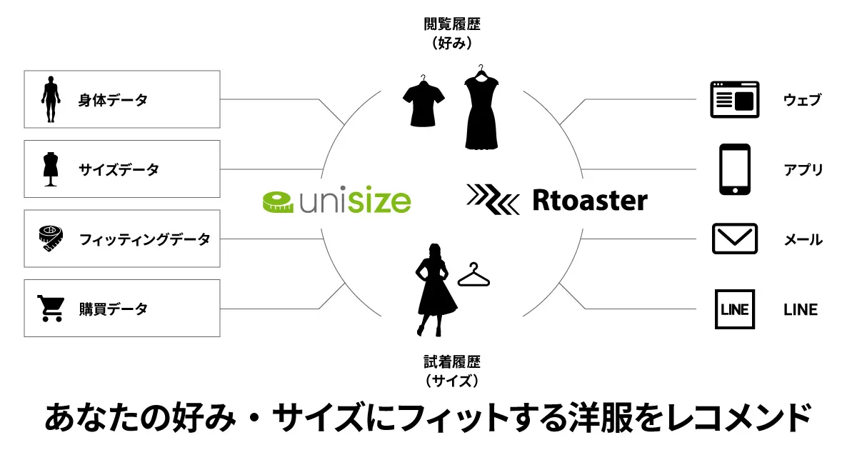 「Rtoaster」と「unisize」の機能連携の第一弾として、まずは「unisize」での試着行動時データを活用し、「Rtoaster」によるECサイト内外でのパーソナライズを実現いたします。