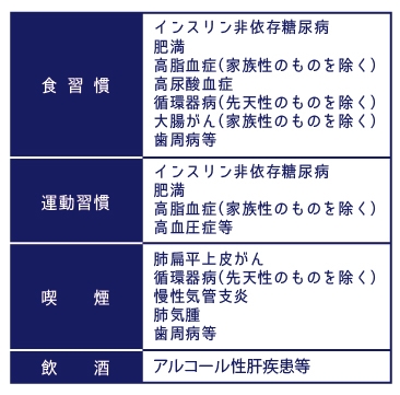 生活習慣病は、「食習慣、運動習慣、休養、喫煙、飲酒等の生活習慣が、その発症・進行に関与する疾患群」のことを指しており、例えば以下のような疾患が含まれるとされています。