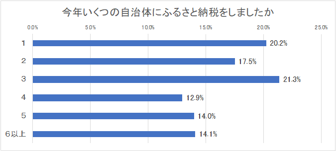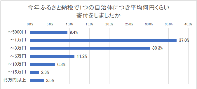 今年のふるさと納税の寄付金額については1人あたり1〜3万円未満と回答された方が27.0%で最も多く、1つの自治体あたりの寄付金額は「1万円未満」が37.0%、1つの自治体にのみ寄付した方は20.2%で複数自治体に寄付する方は全体の8割程度になりました。