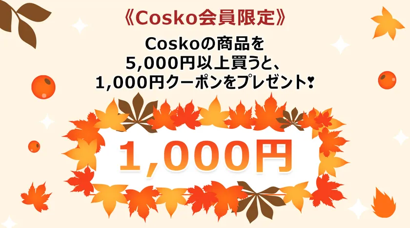 COSKOの商品を5,000円以上買うと、1,000円クーポンをプレゼント。会員限定、次回2,000円以上の注文で使用できるお得なクーポンです。