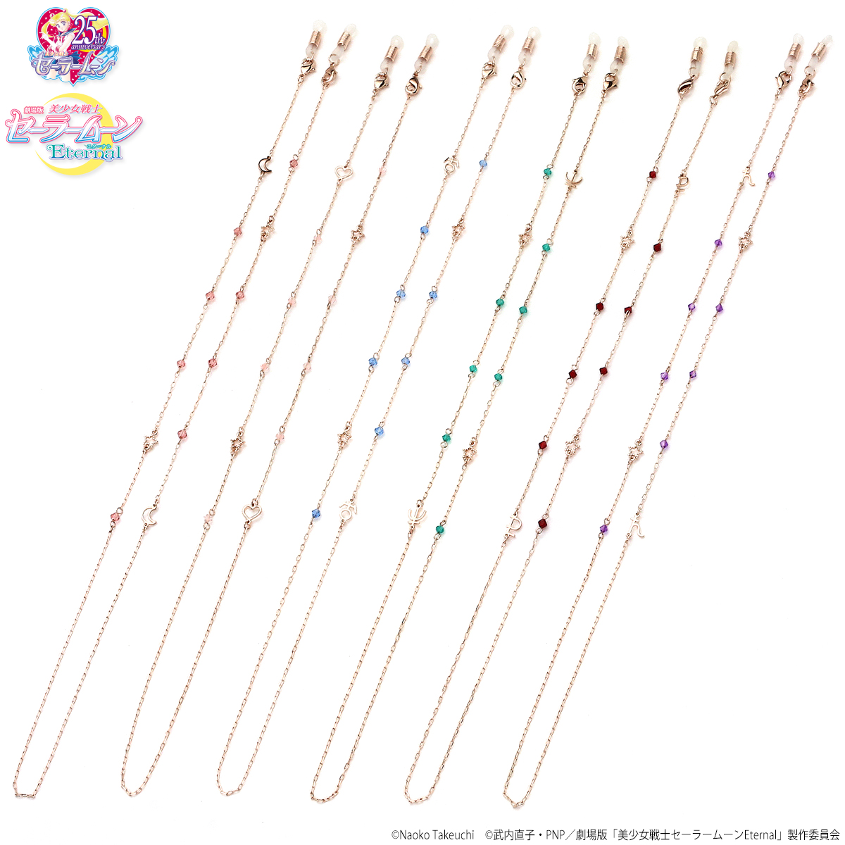 『劇場版「美少女戦士セーラームーンEternal」×JINS コラボレーション グラスコード』は、各キャラクターのイメージカラーを用いたカットビーズ、守護星マーク、星型をちりばめたチェーンタイプのグラスコードです。ネックレスと併用もできる仕様で、ゴールドカラーがどんなファッションとも相性がよく、コーディネートが大人可愛く仕上がります。
