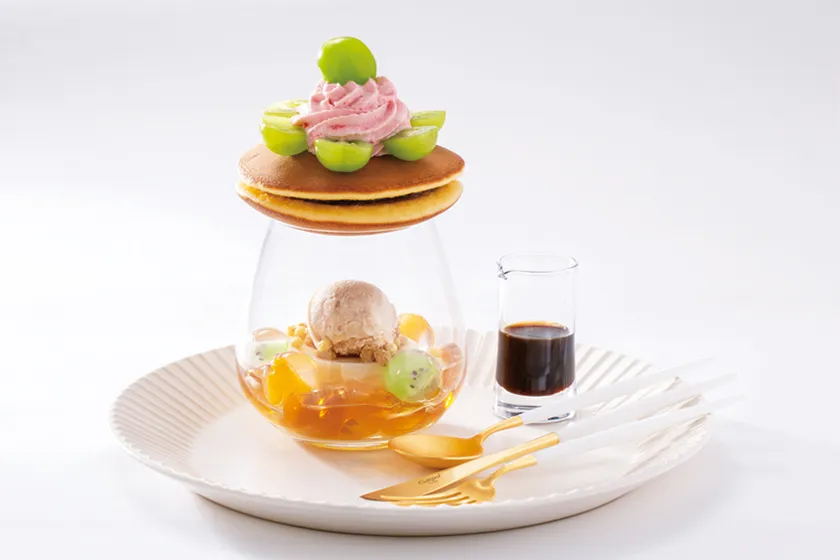 グラスの中には、ほうじ茶ゼリー・豆乳のブランマンジュ・グラノーラ・九龍球(クーロンキュウ/フルーツのゼリー)・きなこアイスクリームを重ねて。さっぱり口当たりのよい味わいでまとめることで、みかさの風味を引き立てます。お好みで黒蜜をかけてお召し上がりいただきます。
