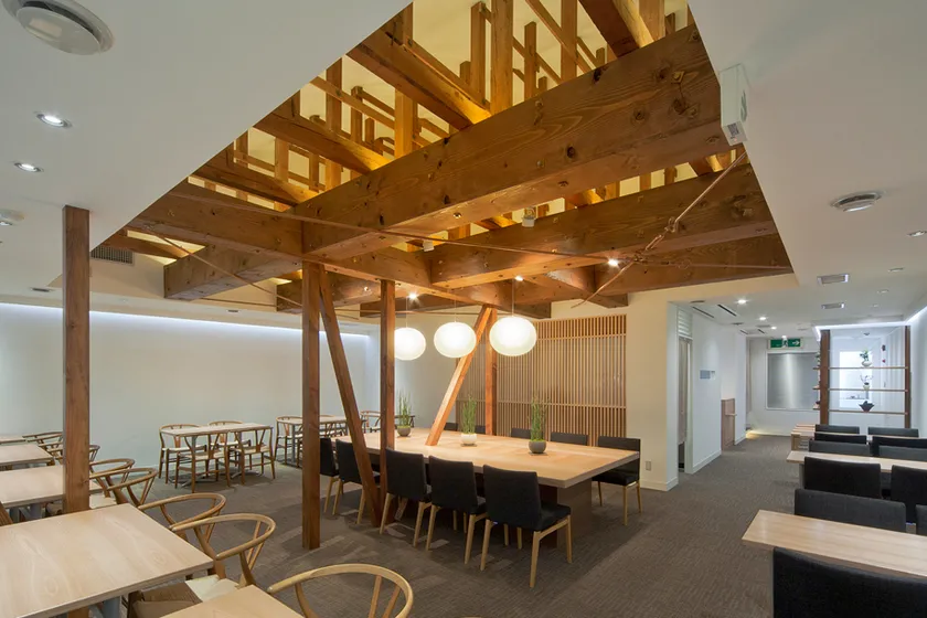 河原町では少なくなった木造建築に眠っていた棟高な屋根裏を吹き抜けにし、和モダンな空間に。