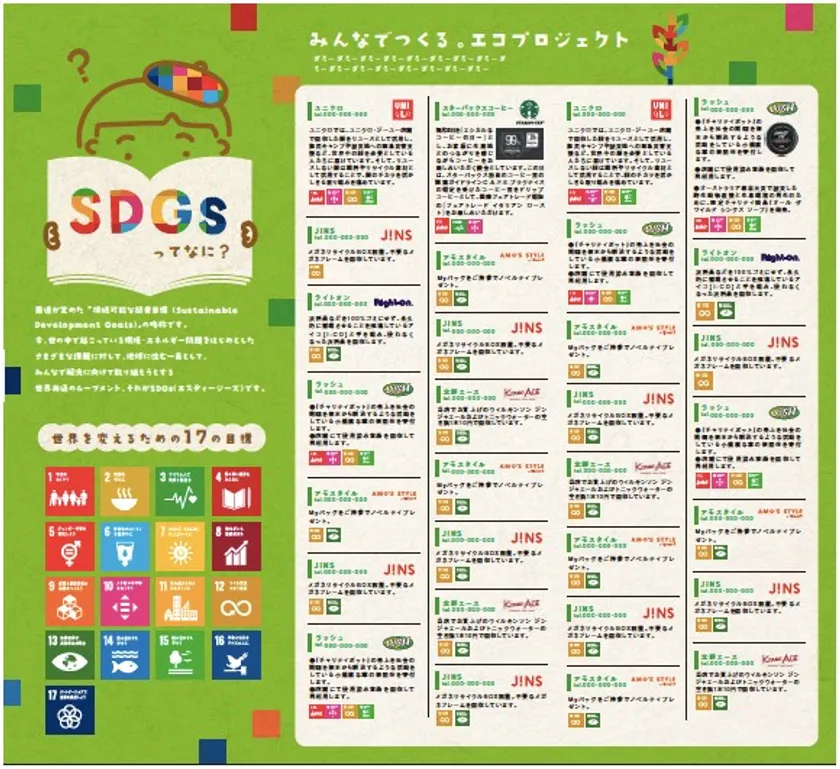 当施設の各テナントにおいても様々なSDGsについての取り組みを行っております。それらを一つにまとめて、館内でリーフレットにしてご紹介していきます。ぜひ手にとって、ご覧ください。