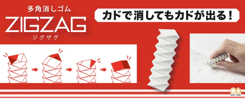 サンスター文具株式会社(本社:東京都台東区、代表取締役社長:小林 大地)は、カドで消してもカドが出る多角消しゴム『ZIGZAG(ジグザグ)』(200円・税抜/220円・税込10%)を2020年9月下旬より順次展開いたします。