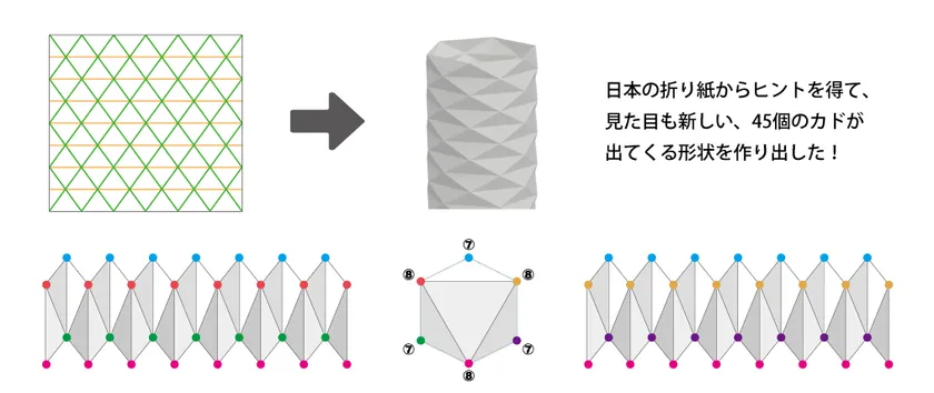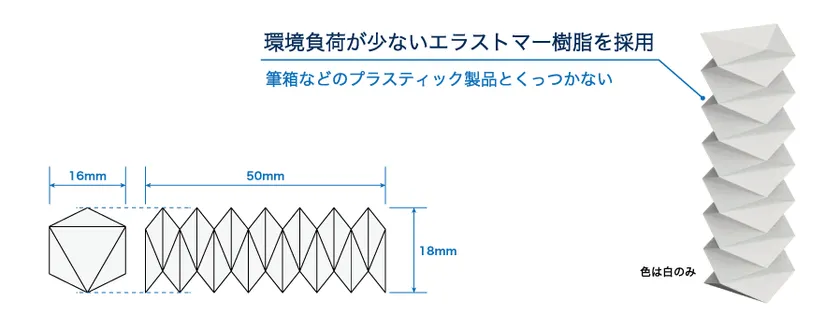 日本の折り紙をヒントに、カドがたくさんあり、カドで消した後も新しいカドが出てくる新形状の多角消しゴムです。1つの消しゴムになんと45個のカドがついており、業界内でカド数ナンバーワン(※)消しゴムの誕生です!