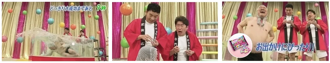 「押すなよ! 絶対に押すなよ!」。スタジオに響き渡る悲痛な叫びもむなしく、熱湯風呂に突き落とされた上島さん。熱湯を全身に浴び、苦しみながら風呂桶から這い上がる上島さんが目指すのは、氷が入っているはずの青いタライ。しかし、タライの中に入っていたのは、個包装で便利なあの商品だった!