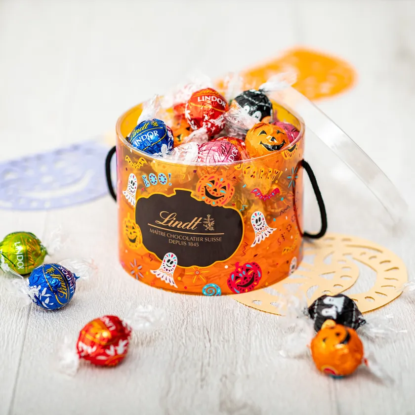 トリック・オア・トリートにも使えるバケツ型のラウンドボックスに、「リンドール ハロウィン」「リンドール ゴースト」をはじめ、「リンドール」の人気フレーバー7種をアソート。