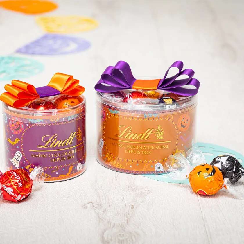にぎやかにハロウィンのキャラクターをちりばめたデザインのギフトボックス。ピック&ミックスで選んだお好きなリンドールを詰めてオリジナルギフトが作れます。