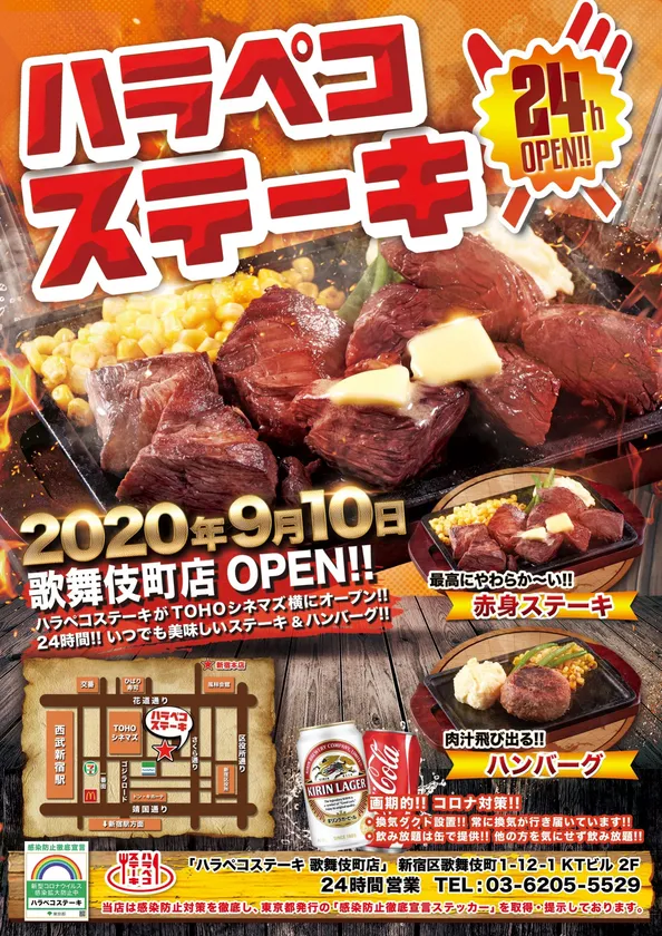 24時間営業の赤身ステーキ&粗挽きハンバーグ専門店 ハラペコステーキの2店舗目となる「新宿歌舞伎町店」 2020年9月10日(木)にオープン!
