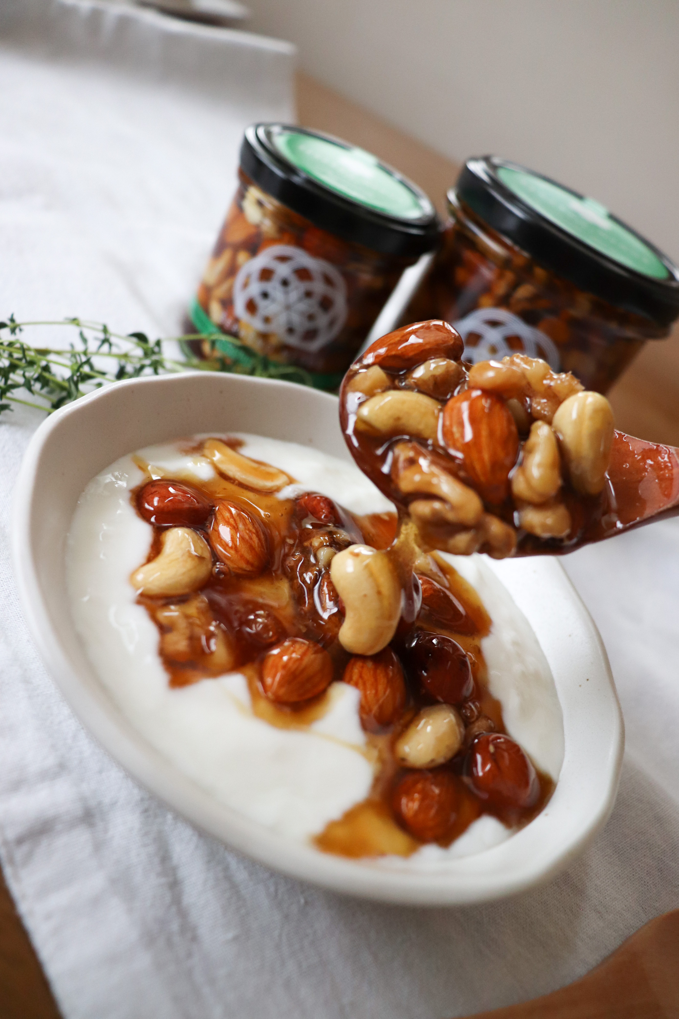 ところが非加熱はちみつは低温になると結晶化して白濁します。はちみつが白濁していれば、ホールナッツの美しいフォルムは見えなくなってしまいます。高温で加熱すればはちみつは透明になるのですが、その反面はちみつに含まれる栄養素や成分が壊れたり風味が失われたりします。