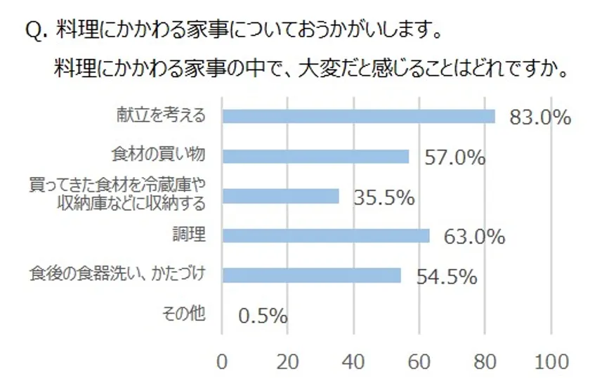 今回の調査では、83.0%が「献立を考える」ことが大変だと答えており、「食材の買い物」や「食後の食器洗い、かたづけ」にも半数以上の票が入るなど、「調理」そのものに匹敵するほど、大変な“名もなき家事”であることが明らかになりました。