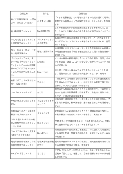 14団体の内訳は、「おくすり110番」「竹あかり」「Idea×Tech」など先輩から引き継いで活動を続けている7団体と、「プロスポーツビジネス研究会」や「地域共創隊WITH」「こもらんびと」など新規7団体です。