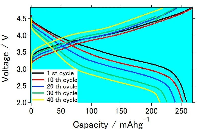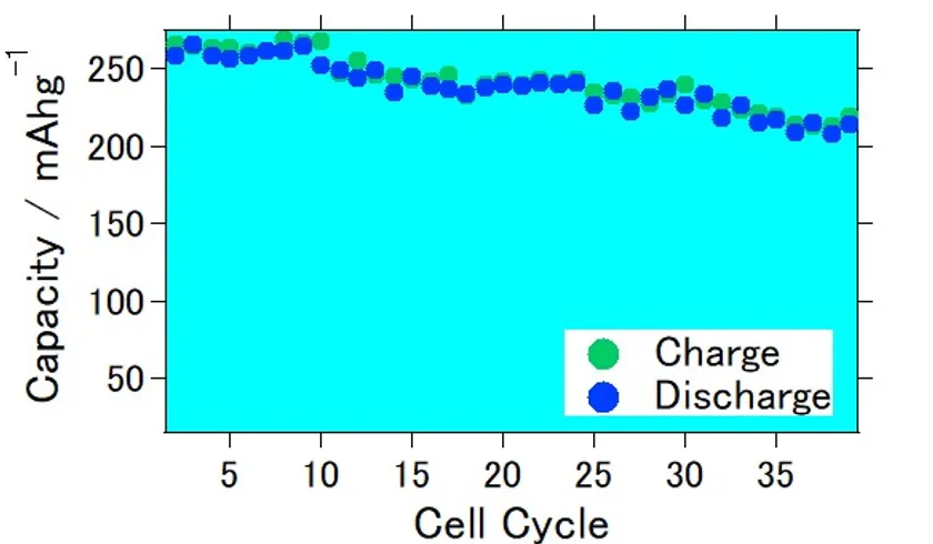 結果、0.1Cの印加電流条件下で初期的に約265mAh/g、そして40サイクル後も215mAh/gという比較的大きな電池容量を有するリチウムイオン電池を作ることができました。この電池容量は負極にリチウム金属を用い、正極中のリチウム過剰型正極活物質の重量に対して計算した数字です。約40回の充放電サイクルで約20%弱の容量低下は観察されているので、今後もサイクル特性の向上、そしてさらなる電池容量の向上などの改良のために研究開発を続けます。またリチウム金属ではなく、負極に炭素系材料を用いて試作セルを作成し、リチウム金属を用いた時と比較して約80%程度の電池容量があることを確認しているので、リチウム過剰型正極材料を用いたリチウムイオン電池の製造、実用化を目指します。