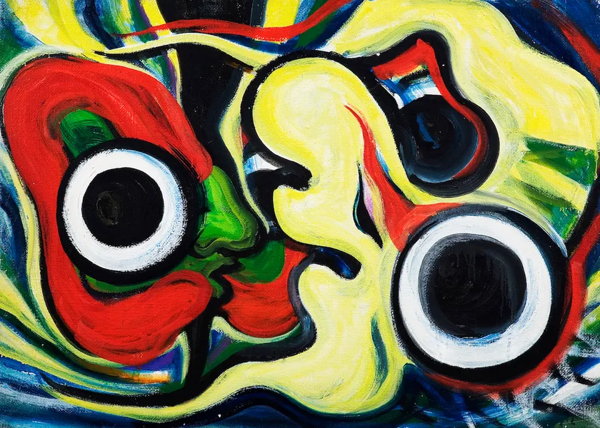 とりわけモチーフとして頻出するのが「対峙する眼」です。ふたつの“いのち”が語りあい、睨みあい、笑いあう。そしていつのまにか、複数の眼が生命力をたぎらせ、群れをなして鑑賞者を睨みつけてくる。