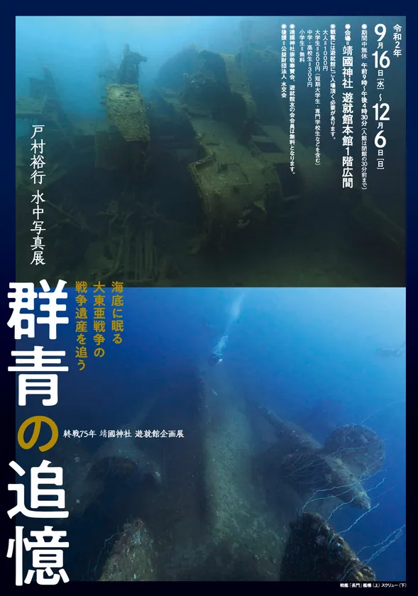 OCEAN PLANET(代表:水中写真家・戸村裕行)は、世界の海底に眠る日本の艦船、航空機、潜水艦といった過去の戦争遺産を撮影した水中写真展『群青の追憶』~海底に眠る大東亜戦争の戦争遺産を追う~を、靖國神社・遊就館(東京都千代田区九段北3-1-1)本館1階広間にて令和2年9月16日(水)~12月6日(日)まで開催致します。