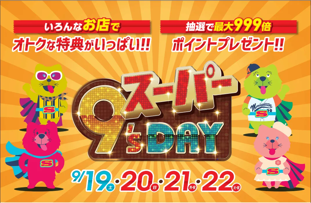 <キューズモールの9月のイベント> スーパー9’s DAY いろんなお店でオトクな特典がいっぱい!! 抽選で最大999倍ポイントプレゼント!! 各施設でも特別なキューズデーを開催!