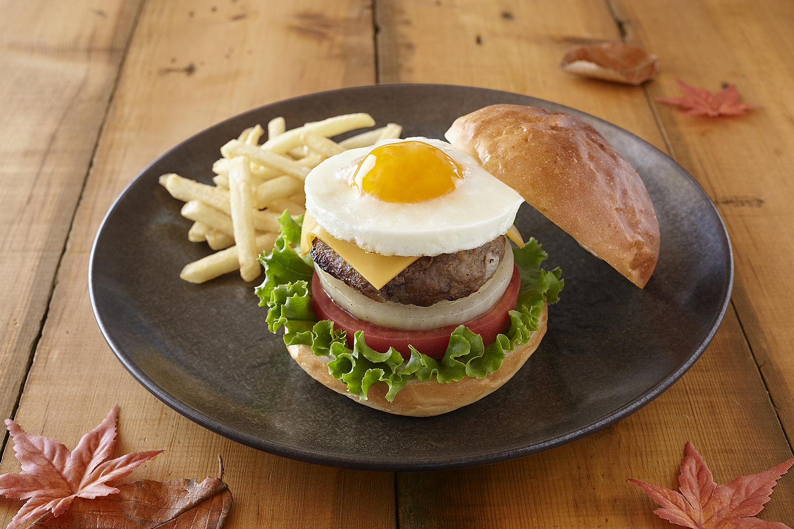 肉のうまみ際立つ幻の和牛”「葉山牛」入りの「極上 鎌倉ハンバーガー」に、お月様に見立てた平飼いブランド有精卵“さがみっこ”、湘南鎌倉野菜とチェダーチーズ、自家製ソースを挟んだ秋限定商品。バンズは、鎌倉名物「極上 鎌倉生食パン」と同じ生地を使用。揚げたてのフライドポテトとドリンク付き。