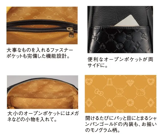 つややかなピアノブラックの牛革に浮かび上がるのは、ハローキティのおしゃれなモノグラム柄。ブリリアントカット、ペアシェイプ、ハートカットといった宝石モチーフとハローキティが、トレードマークのリボンとともに型押しされています。
