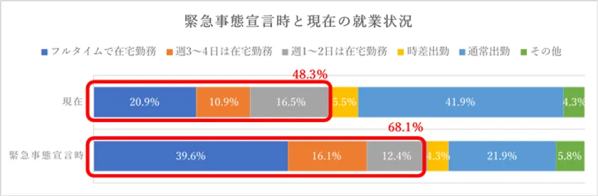 緊急事態宣言時と現在の在宅勤務状況について尋ねると、緊急事態宣言時では68.1%の方が在宅勤務(週1~2回含む)を行っていましたが、現在では48.3%の方が在宅勤務をしている状況であると回答しました。