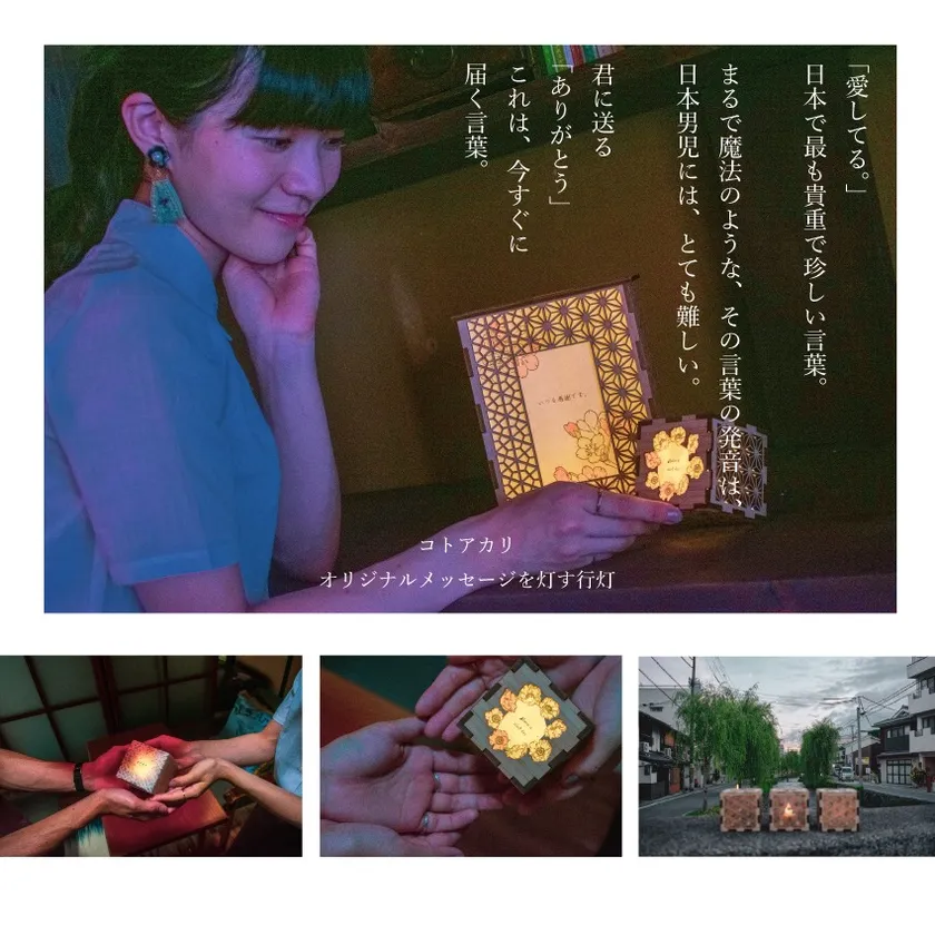 コトアカリはオリジナルのメッセージをプレゼントできる行燈です。日本では古くから、「言葉」は「事(コト)」であるという考え方が定着していました。物質ありきではなく、言葉にして初めて物は存在できるのだ、と。また、日本の伝統的な「灯り」は、普遍的に定義される「明かり」とは、違った存在意義を持ち、江戸時代には明るい当時の灯台よりも、行燈などによる間接的な「灯り」がよく使われ、古来より「灯り」は私たちの生き方を照らしてきました。そして、日本の「有難う」は英語の「Thank you」とは根本的に違う見方をします。何かをしてもらったことへの感謝を表すのが「Thank you」であるのに対して、「有難う」は「有ること」が「難しい」、さまざまな支えがなければ、存在することが難しいすべての命への感謝です。グローバルの名の下において、このような日本の文化や伝統は、忘れられてきているのです。コトアカリは、そのような「感謝(コトバ)」を「灯り」で照らし、誰かに届けることで、希薄になりつつあるさまざまな「支え」に気づくためのものでもあります。詳しくは、当社HP・Makuakeのページにてご確認ください。