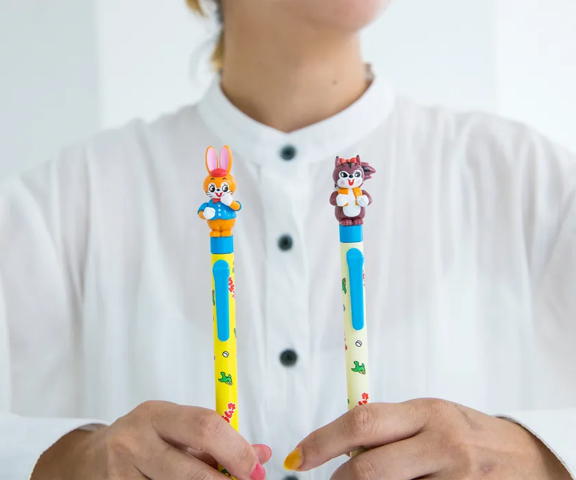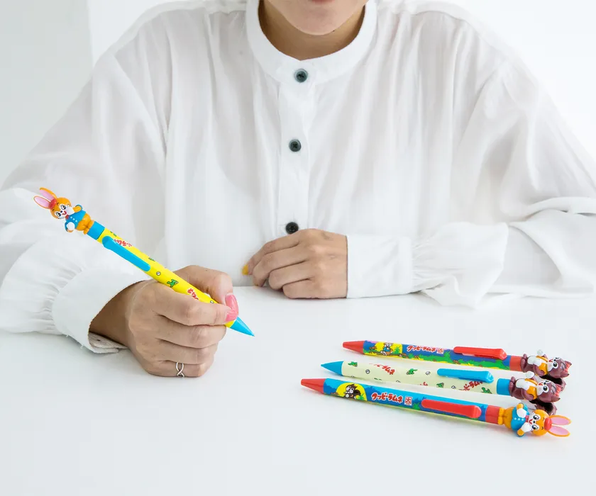 アクションペンはノックする度にクッピー(ウサギ)とラム(リス)がラムネを食べるような可愛い動きをするのが特長です。