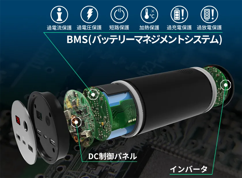BMS(バッテリーマネジメントシステム)という製品のバッテリーに異常が出た際に保護を行う機能を搭載しております。さらに、耐落下・衝撃テスト、耐熱テスト、過電圧テストなども綿密に行い、安全を第一に考えて開発を行っております。
