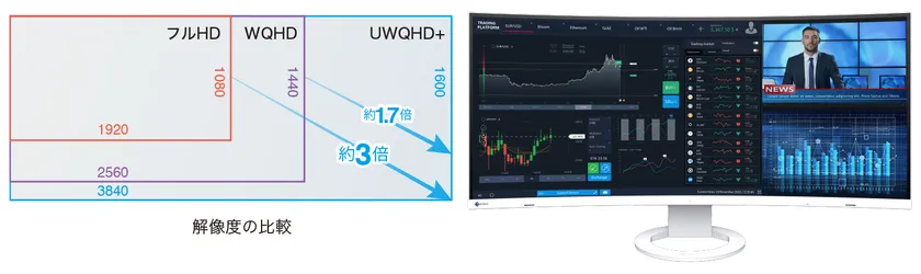 これに対し、当社は、FlexScanシリーズ最大の37.5型横長大画面に、フルHDの約3倍に相当するUWQHD+(3840×1600)高解像度により膨大な情報を表示するEV3895を発売します。緩やかな弧を描いて湾曲した横長の1画面に、複数のウィンドウを自由なレイアウトで一覧表示できるので、作業効率が向上し、仕事の生産性が高まります。