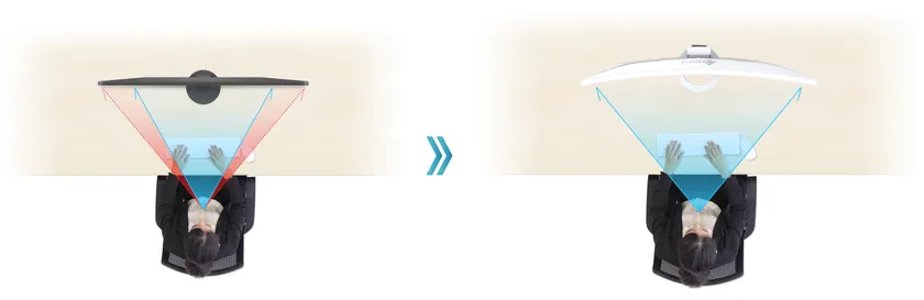 大型モニターは、平面のままでは、画面の左右端に近づくほどユーザーの目と画面の距離が離れ、画面を正対視できなくなり、視認性が損なわれるという問題点があります。EV3895の画面は、ユーザーを中心に緩やかな弧を描いて湾曲しているので、大画面ながら両端まで見やすく、没入感があり、作業に集中しやすくなります。
