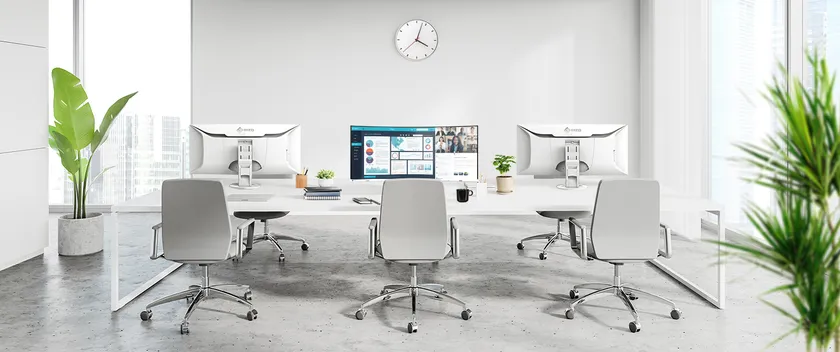 画面の枠を感じさせないスリムな3辺フレームレスデザインを採用。オフィスの雰囲気をぐっと明るくするホワイトモデルも用意しました。端子や接続ケーブルをキレイにまとめる専用のカバーを付属し、ケーブルマネージメントにも配慮しています。大画面ながら、圧迫感なくすっきりと設置できるので、モニターを使用する空間を先進的かつ開放的にトータルコーディネートできます。